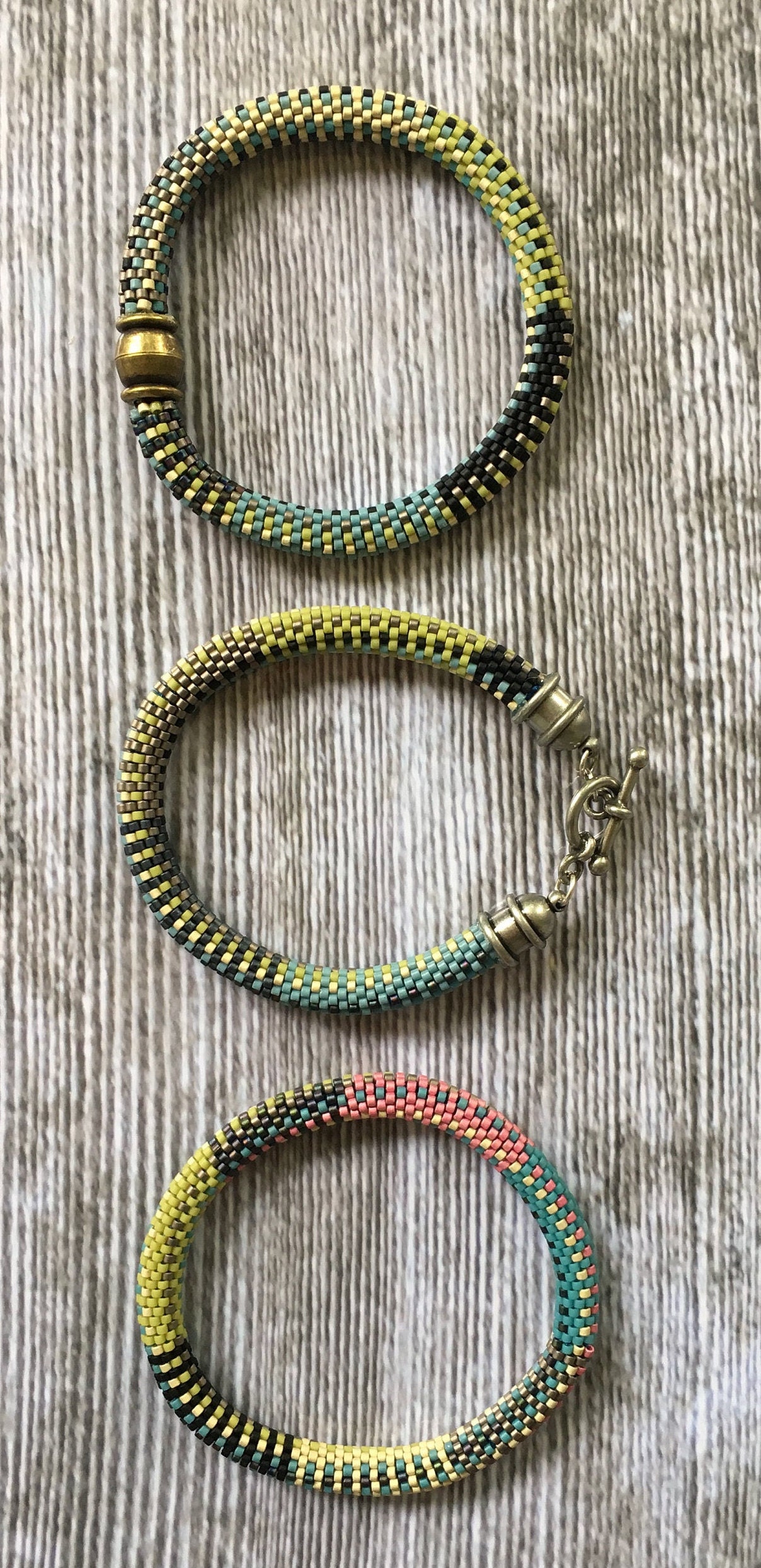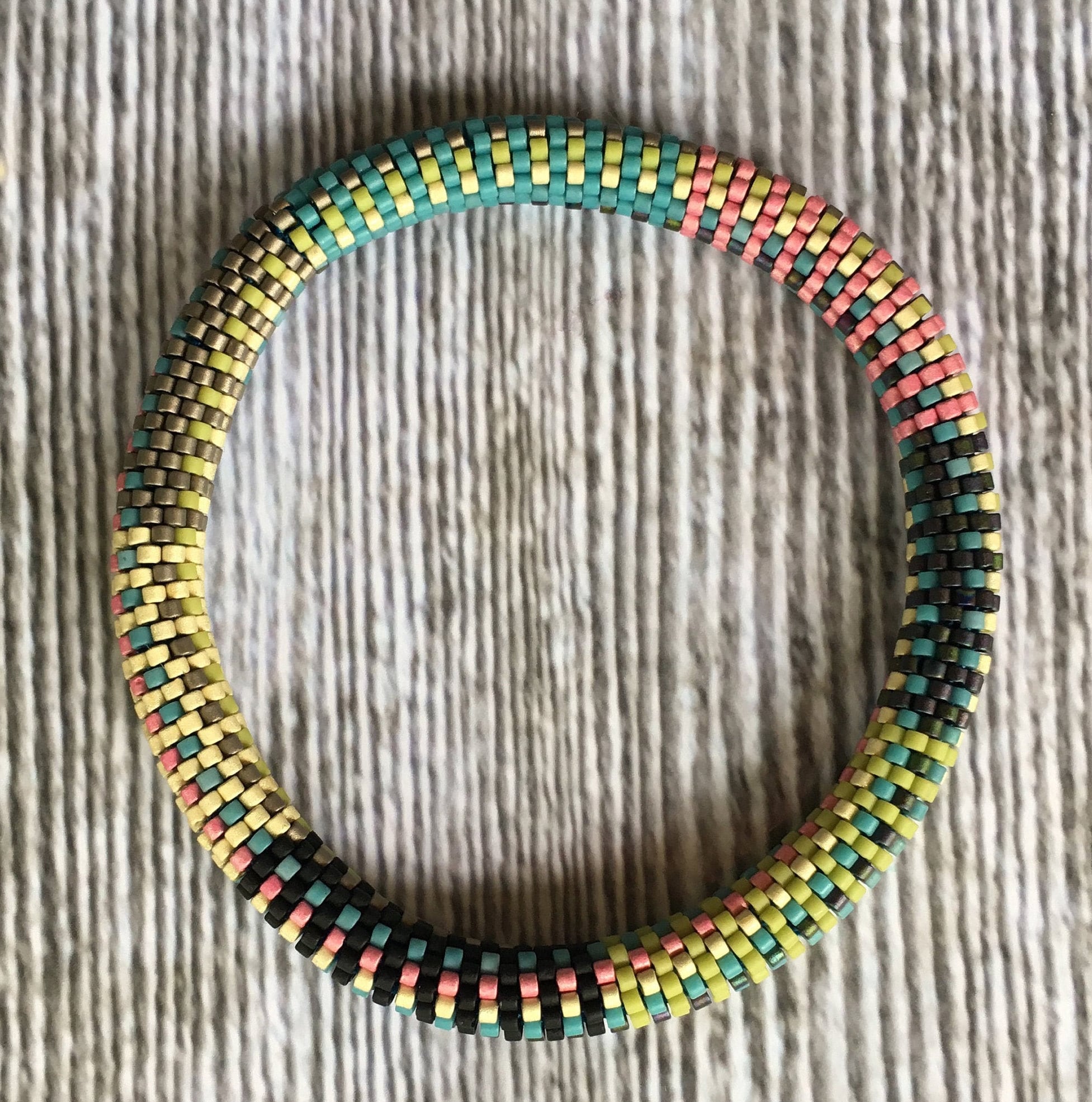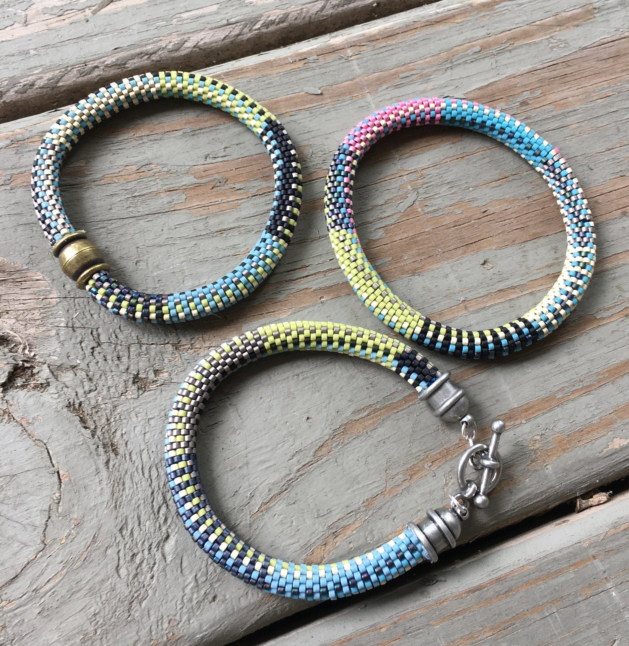Crochet these bracelets using the Slip Stitch bead crochet method in a 9-around pattern. Using size 11/0 Miyuki Delica seed beads in various colors creates an easy pattern to string, then crochet using the slip stitch technique. You must know the slip stitch bead crochet technique to complete these bracelets.