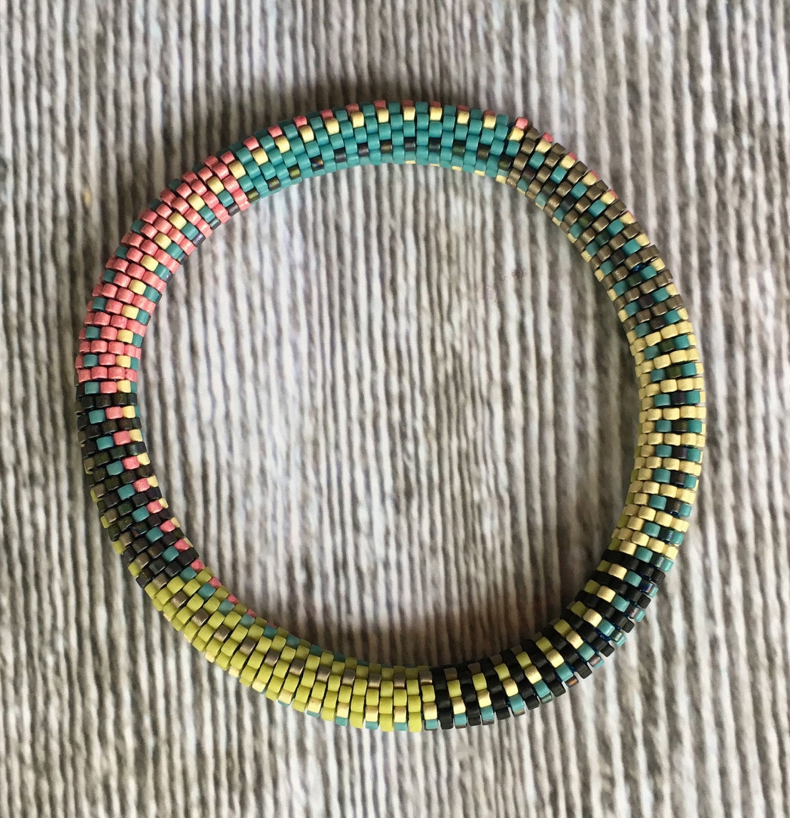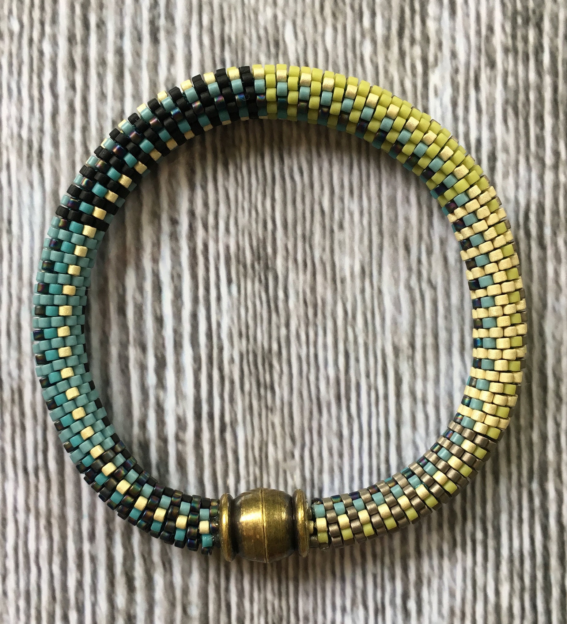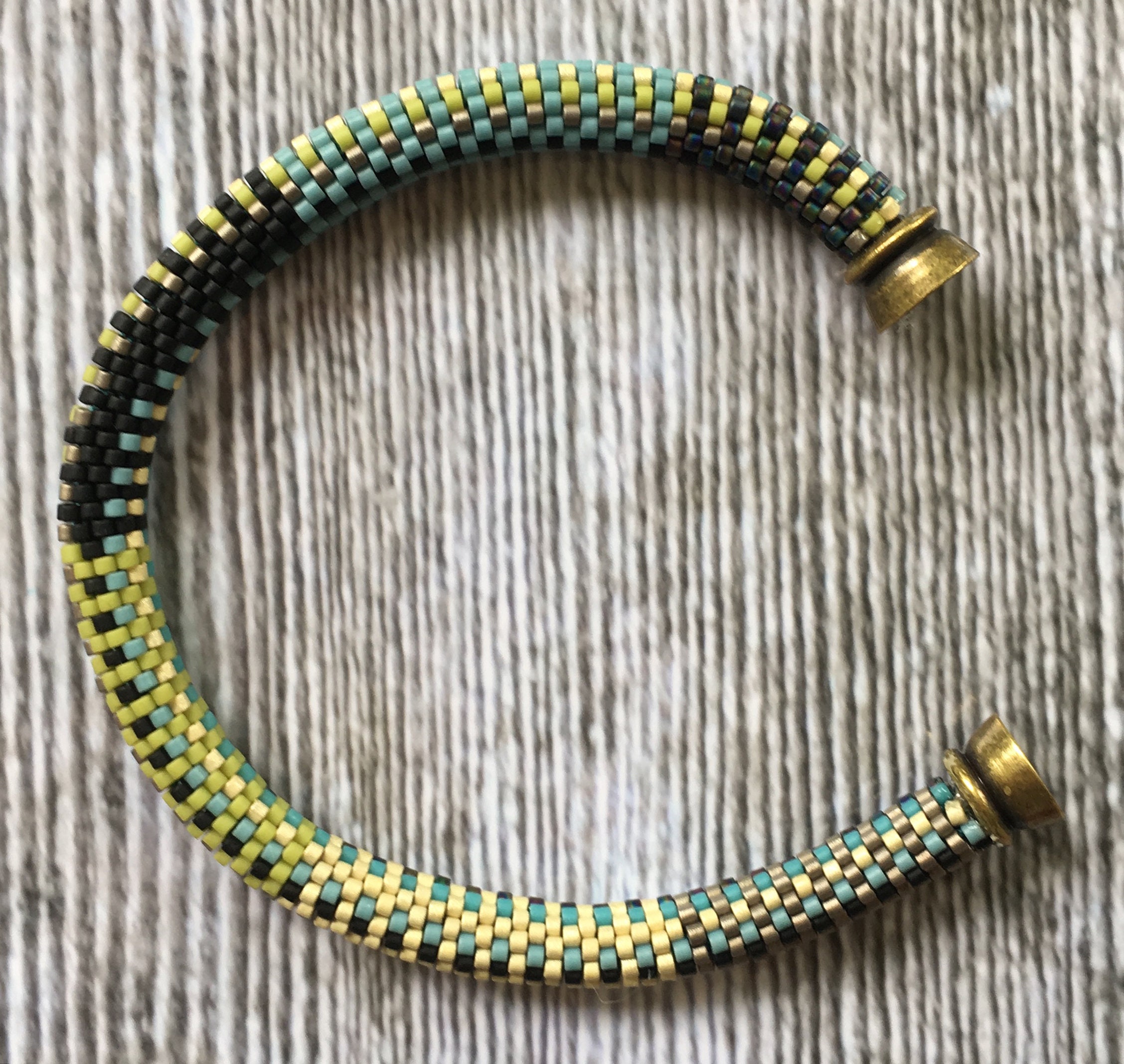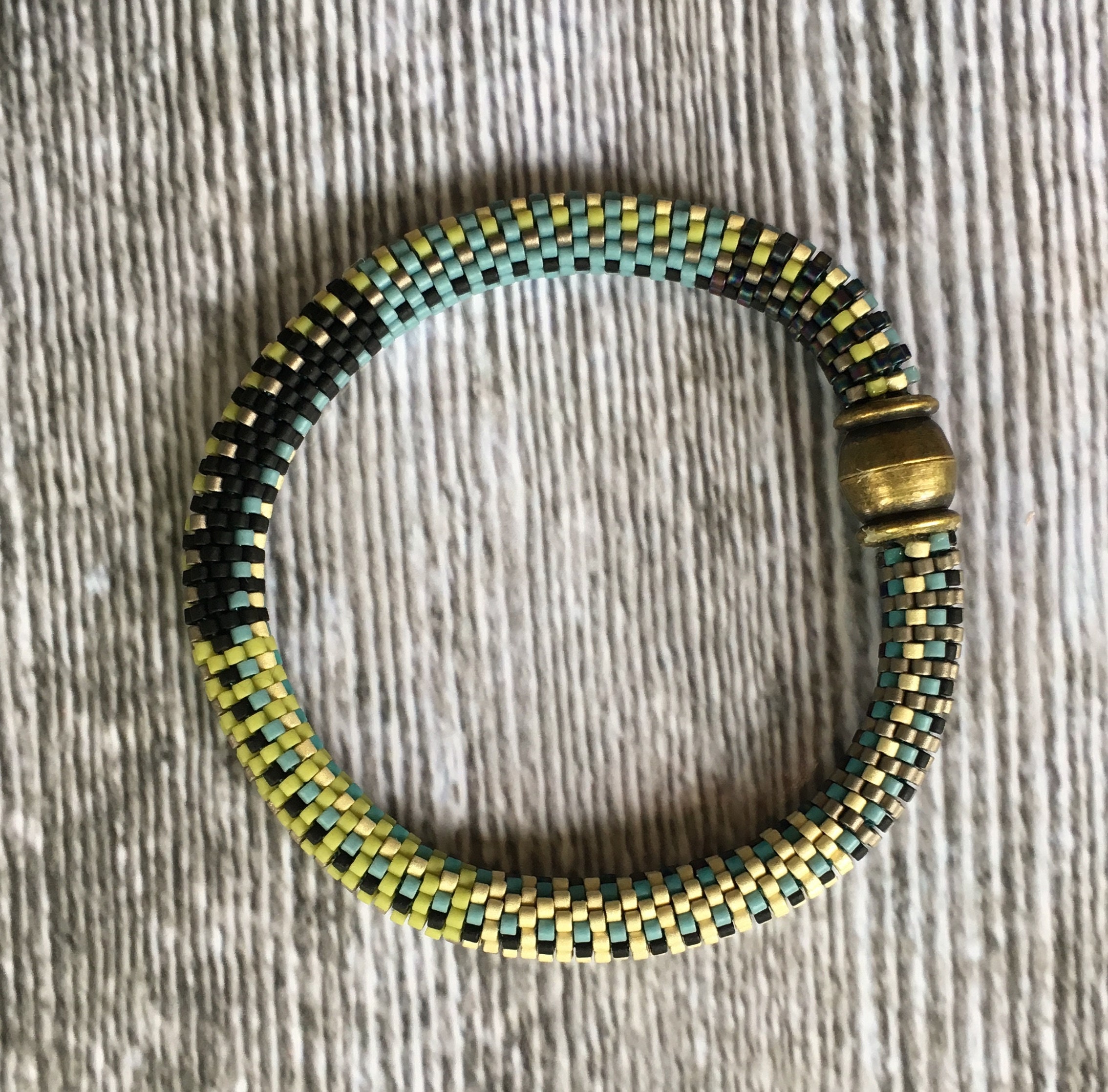 Crochet these bracelets using the Slip Stitch bead crochet method in a 9-around pattern. Using size 11/0 Miyuki Delica seed beads in various colors creates an easy pattern to string, then crochet using the slip stitch technique. You must know the slip stitch bead crochet technique to complete these bracelets.